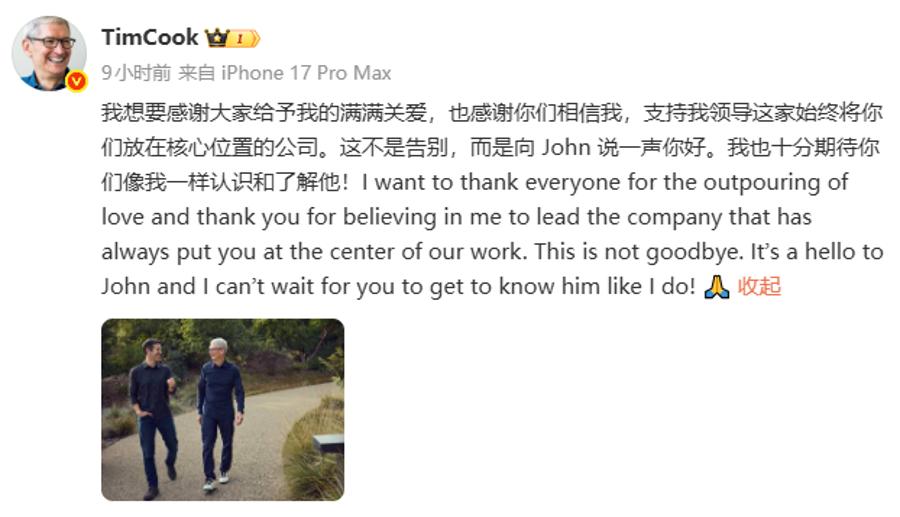 22日,库克发文表示:“我想要感谢大家给予我的满满关爱,也感谢你们相信我,支持我领导这家始终将你们放在核心位置的公司。这不是告别,而是向John说一声你好。我也十分期待你们像我一样认识和了解他!”