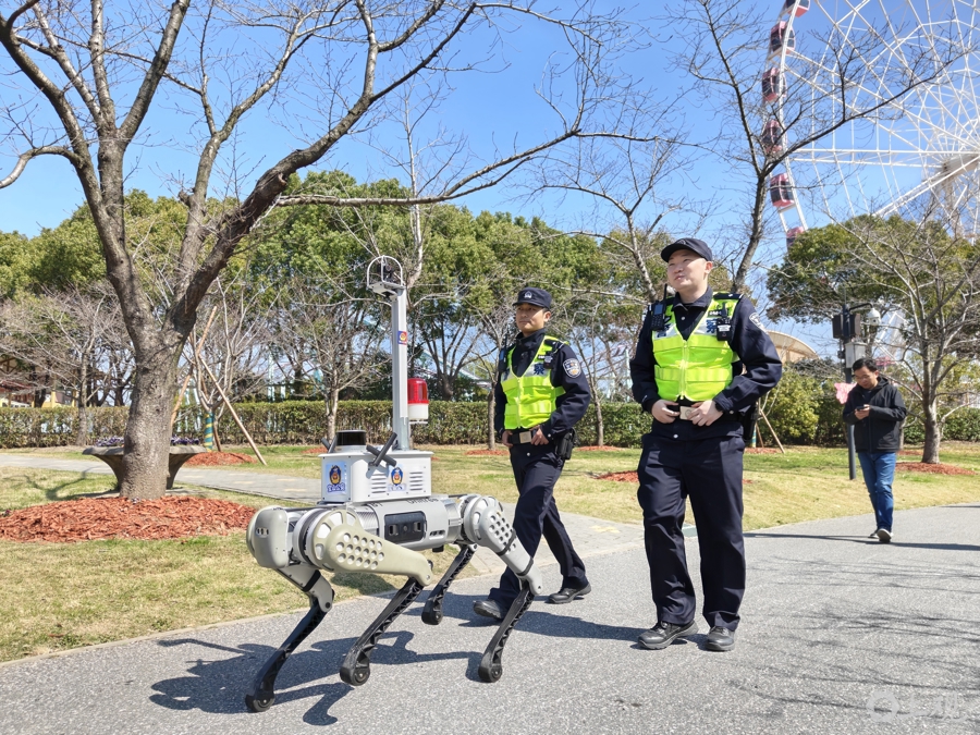 今年樱花节期间,宝山警方在高峰日新增警用机器狗投入巡逻,通过实时图传、语音劝导等功能辅助民警工作效能。